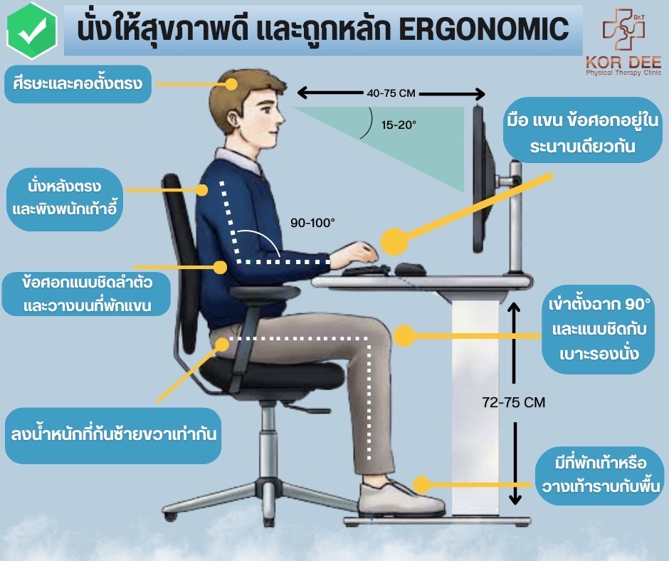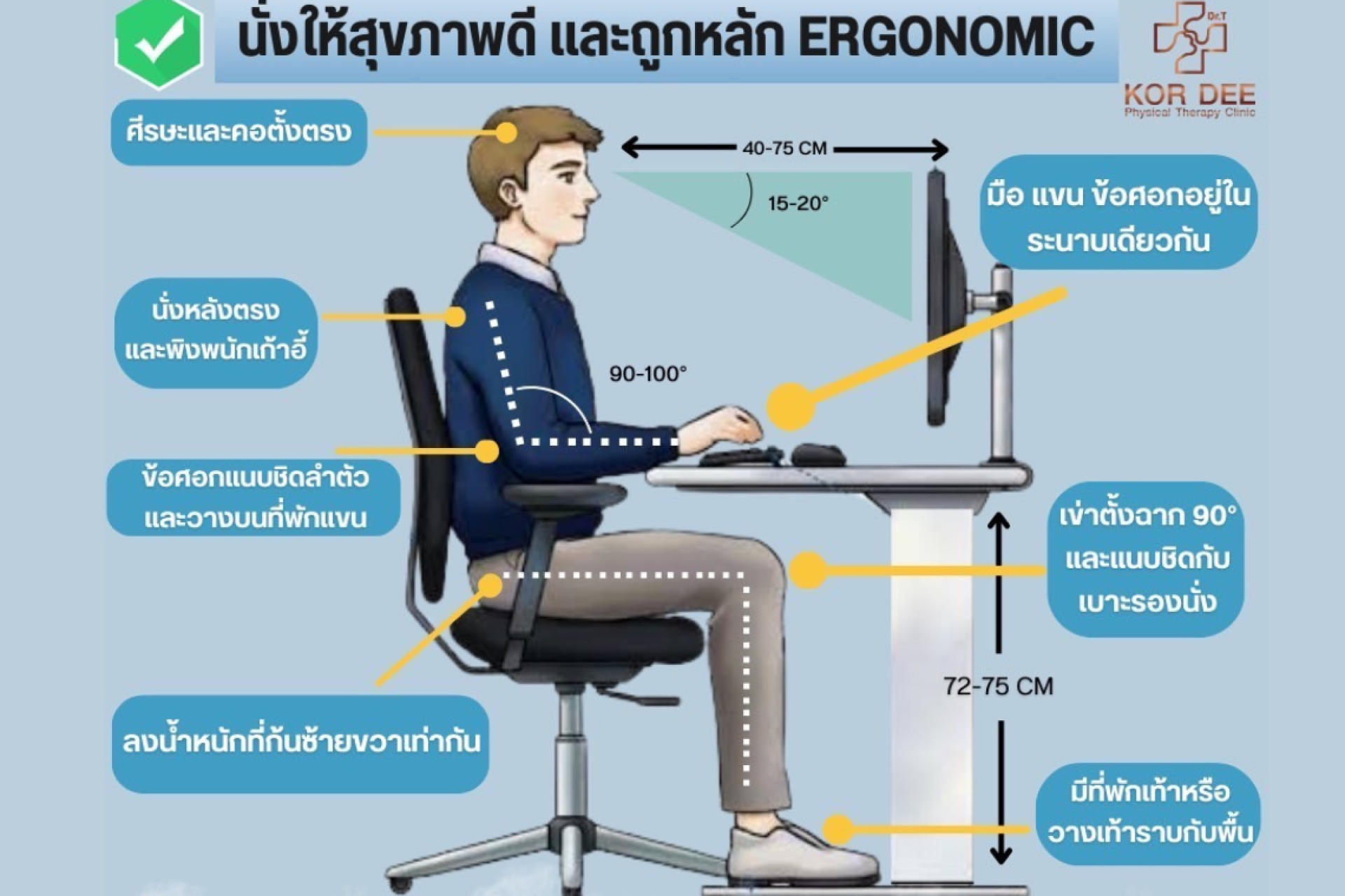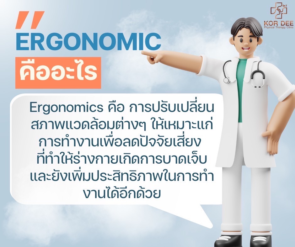>>> Ergonomics หรือ การยศาสตร์ ซึ่งเป็นเรื่องของท่าทางในการทำงาน ท่าทางในการทำงานที่เหมาะสมมีส่วนช่วยให้ร่างกายของเรามีสุขภาพที่ดีและห่างไกลจากโรคกระดูกและกล้ามเนื้ออีกด้วย